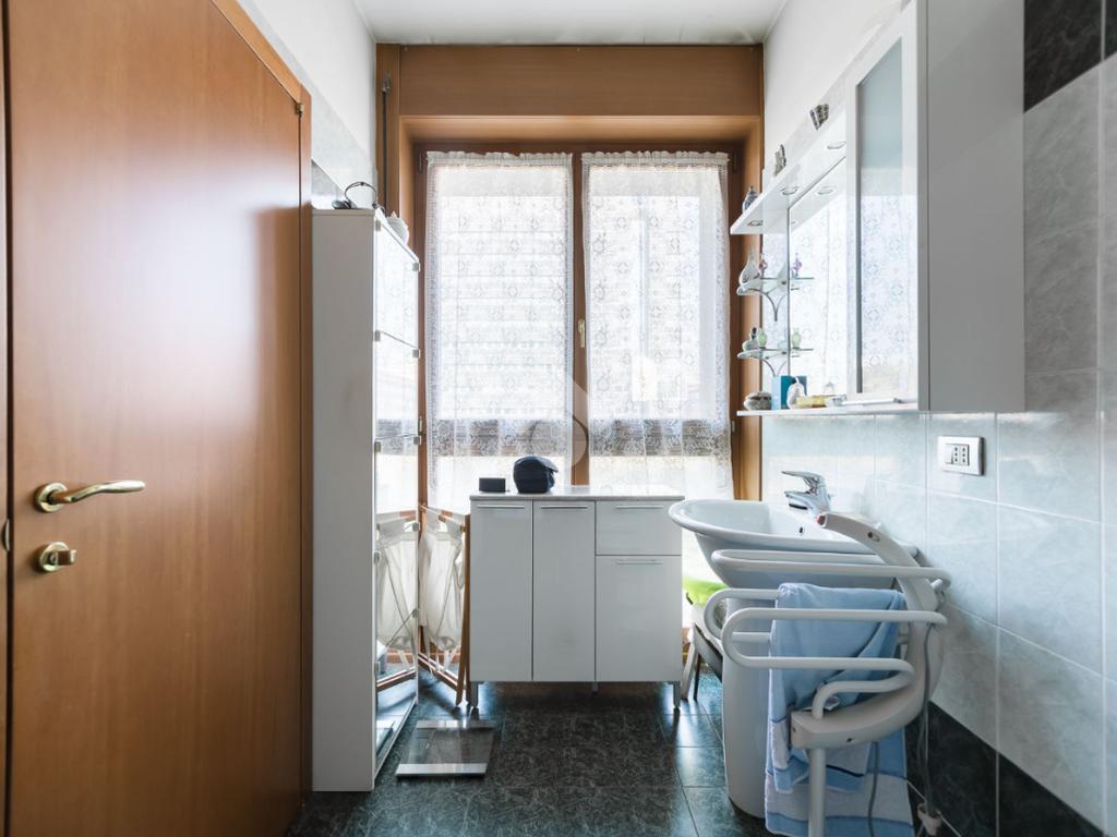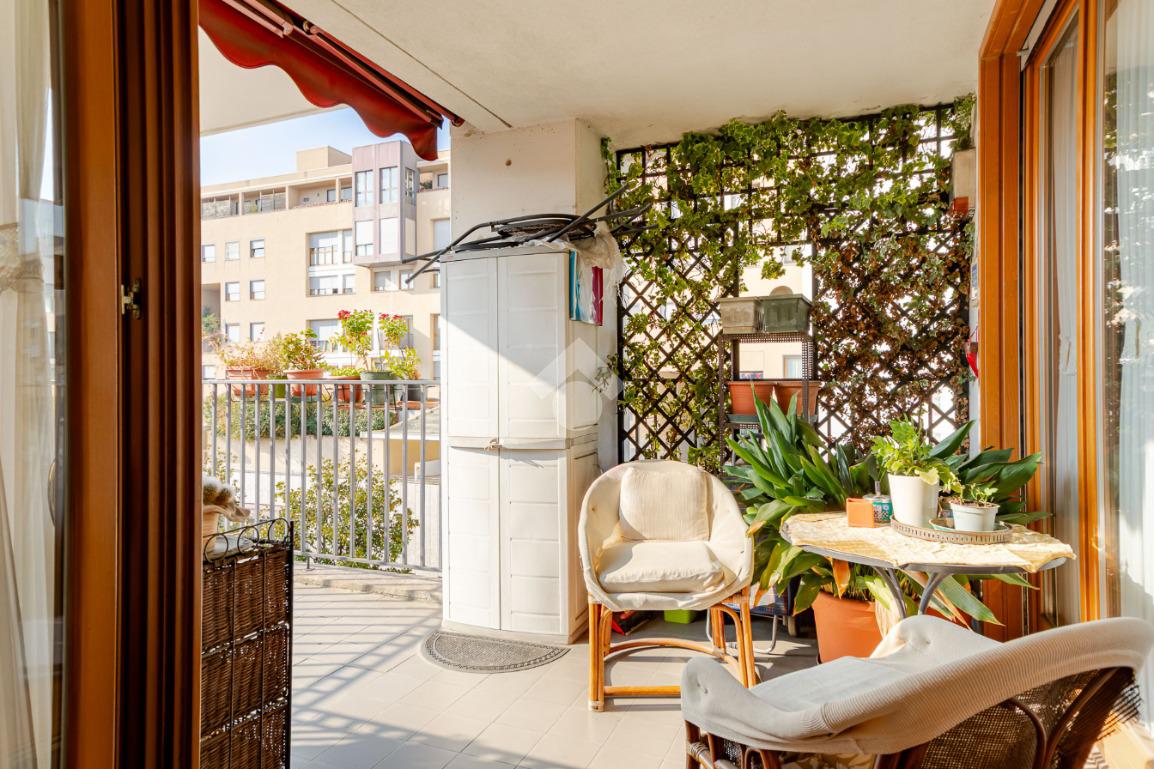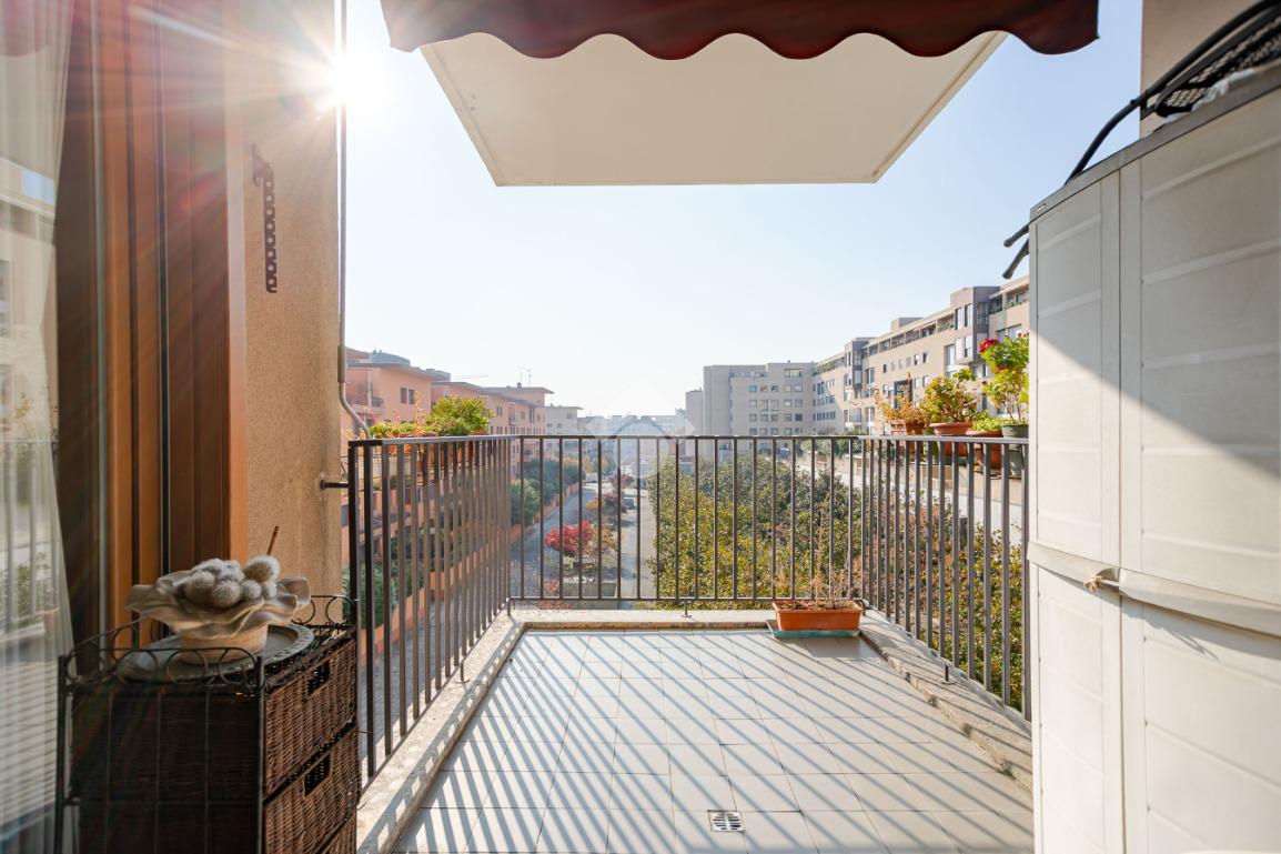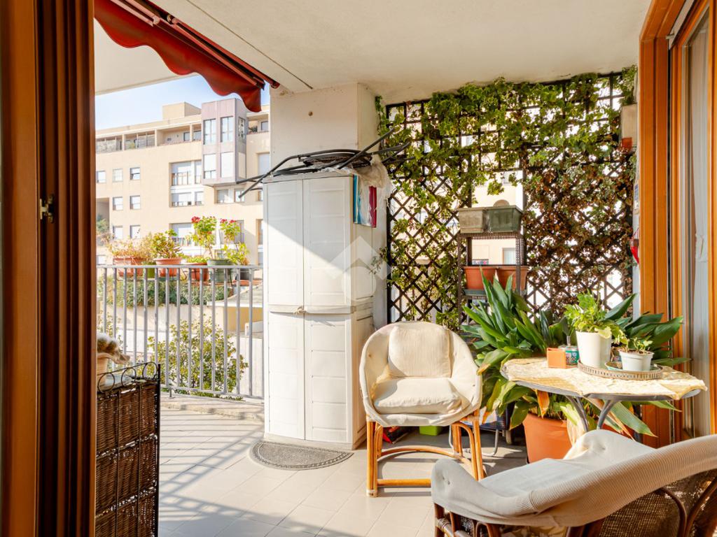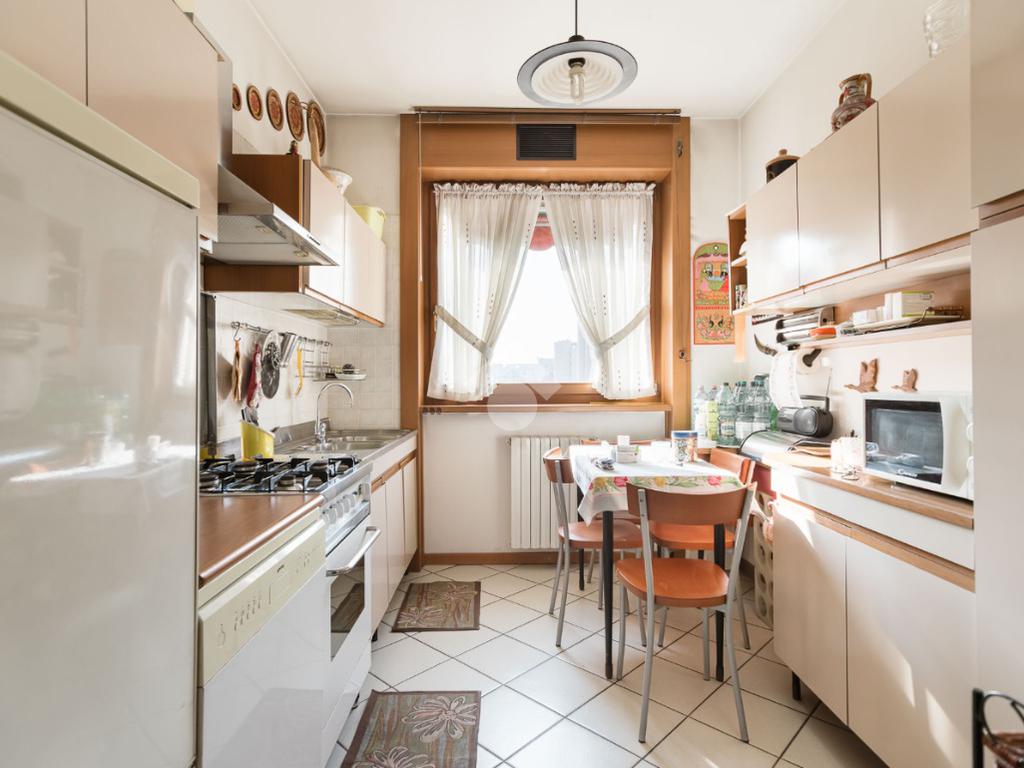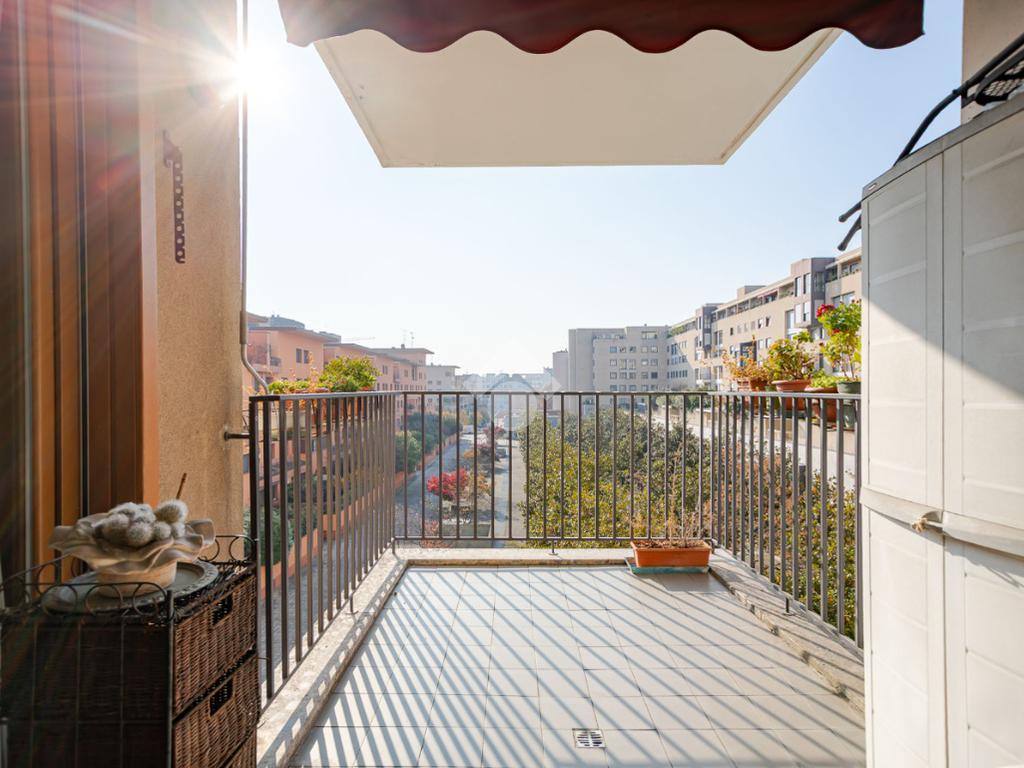In contesto condominiale con servizio di portineria, proponiamo un ampio trilocale situato al terzo piano. L'immobile offre spazi ben distribuiti e luminosi ed è così composto: ingresso, spazioso soggiorno da cui si accede al terrazzo loggiato, cucina abitabile, disimpegno zona notte con camera da letto e bagno en suite finestrato, cameretta, ripostiglio e secondo bagno cieco. Completano la soluzione la cantina di pertinenza e la possibilità di un box singolo ad Euro 25.000. L'appartamento è in buone condizioni interne, dotato di teleriscaldamento e teleraffrescamento con fan - coil.